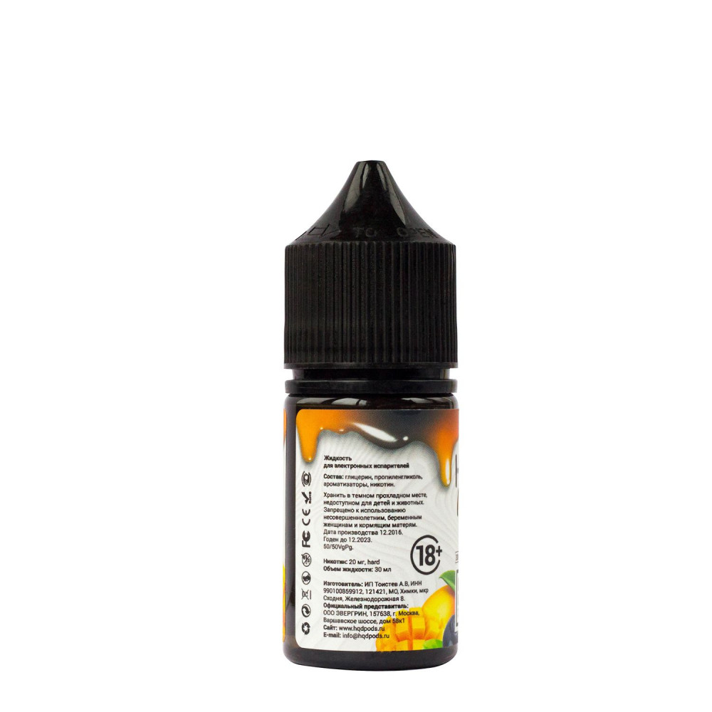 Жидкость HQD MIX IT Манго Черника - это уникальная солевая жидкость, разработанная специально для использования в электронных сигаретах. Она отличается от обычных жидкостей для заправки электронных сигарет своим составом, включающим солевой никотин. Благодаря этому, никотин быстрее всасывается в организм, обеспечивая более гладкое и эффективное удовлетворение потребности в никотине.